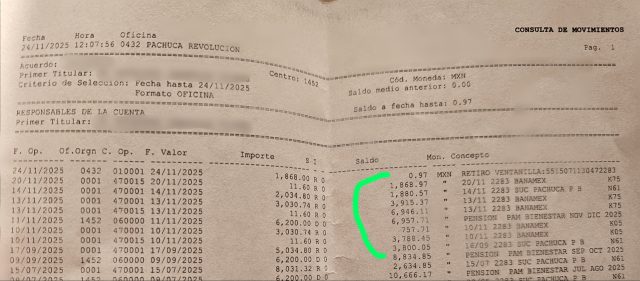 Una pareja de adultos mayores denunció ser víctima de robo, luego de intentar retirar su Pensión Bienestar correspondiente al bimestre noviembre- diciembre 2025, cantidad que por persona es de más de 6 mil pesos.